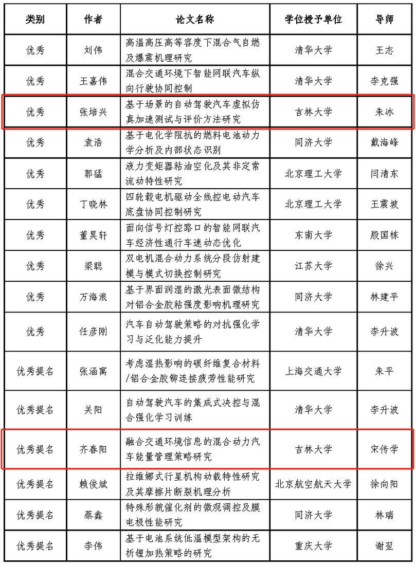 万象城allwincity官网朱冰教授指导的张培兴博士毕业论文《基于场景的自动驾驶汽车虚拟仿真加速测试与评价方法研究》荣获“优秀博士学位论文”,宋传学教授指导的齐春阳博士毕业论文《融合交通环境信息的混合动力汽车能量管理策略研究》荣获“优秀博士学位论文提名”。