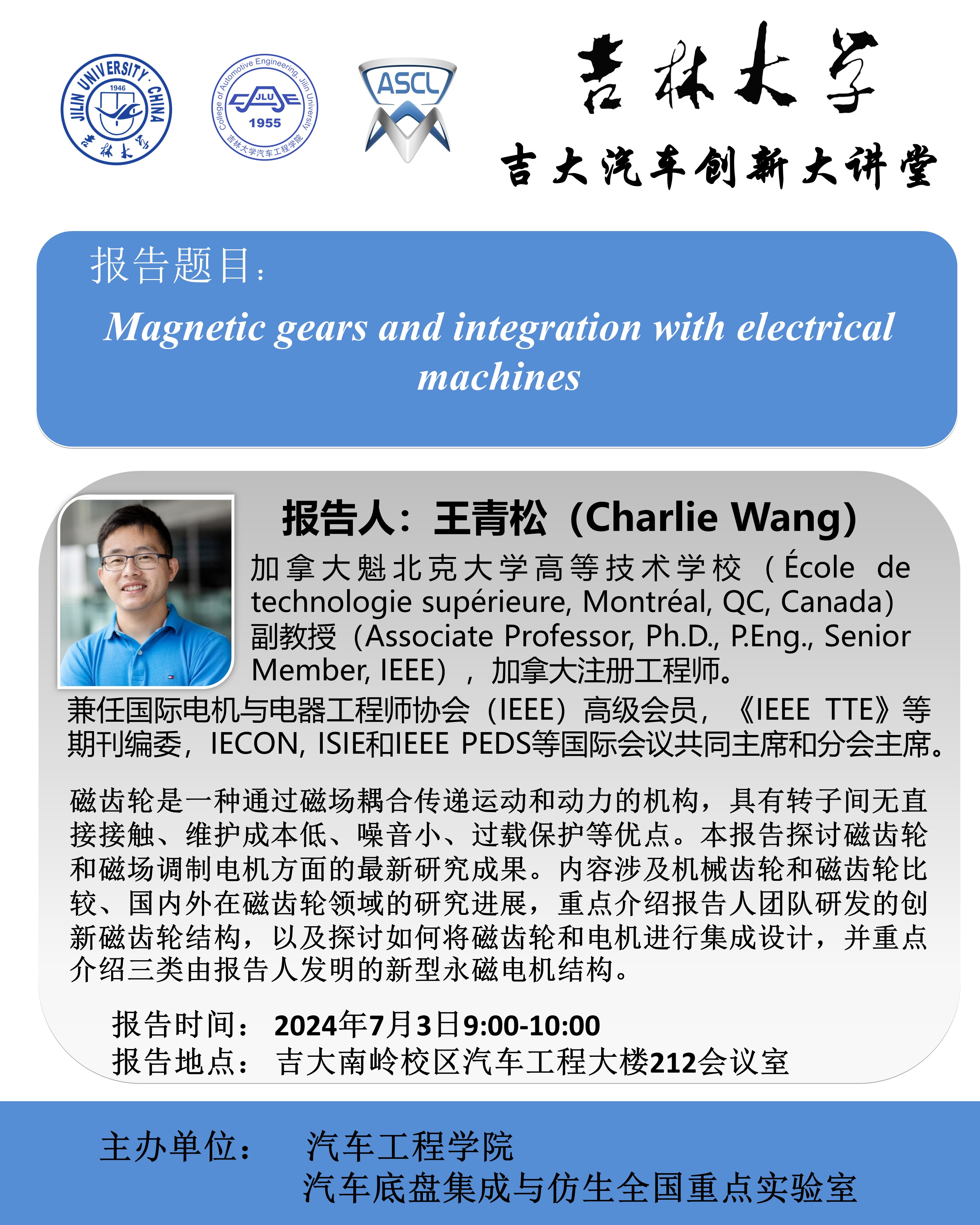 王青松博士简介:王青松博士是万象城官网2008级车辆工程专业本科生,2012年保送至同济大学攻读硕士学位,2015年至2018年在香港理工大学电气工程专业攻读博士学位。2019至2021年在英国考文垂大学先进低碳驱动研究中心担任讲师,现为加拿大魁北克大学高等技术学校副教授,加拿大注册工程师。王博士为国际电机与电器工程师协会(IEEE)高级会员、《IEEE TTE》等期刊编委,并担任IECON, ISIE和IEEE PEDS等国际会议的共同主席和分会主席。王博士在磁齿轮,磁场调制电机和无线充电领域取得了多项创新性成果。目前主持多项加拿大自然科学基金(NSERC)和魁北克自然科学基金(FRQNT)项目,在IEEE Trans. on Trans. Elect.,IEEE Trans. Ind. Electron., IEEE Trans. Magn., IEEE Trans. Power Electron.等国际SCI期刊和IEEE各类国际会议发表论文40余篇。