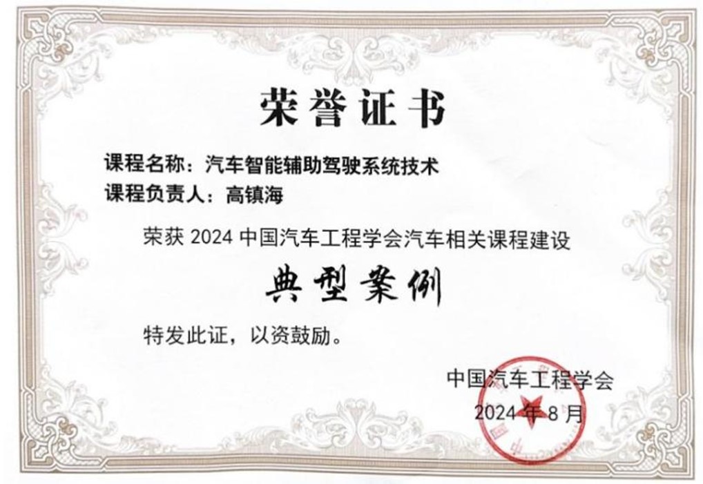 2024年8月,万象城allwincity官网高镇海教授、胡宏宇教授、孙天骏副教授联合开设的“汽车智能辅助驾驶系统技术”课程荣获2024中国汽车工程学会汽车相关课程建设典型案例奖。该奖项是由中国汽车工程学会于2023年首次设立,面向全国高等院校进行汽车相关课程建设案例征集,并将优秀典型案例在全国汽车行业人才培养院长论坛上进行现场展示。