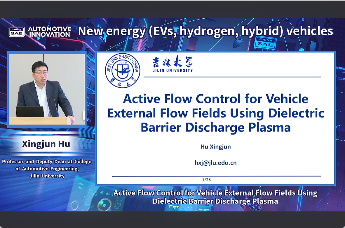 胡兴军教授发表了题为“Active Flow Control for Vehicle External Flow Fields Using Dielectric Barrier Discharge Plasma”的演讲。该研究融合主动控制与被动优化,结合智能驾驶与环境感知系统,构建全工况动态汽车空气减阻策略,在复合工况下实现最大幅度风阻降低与能效提升,为新一代低碳交通装备研发提供理论支撑与应用范式。