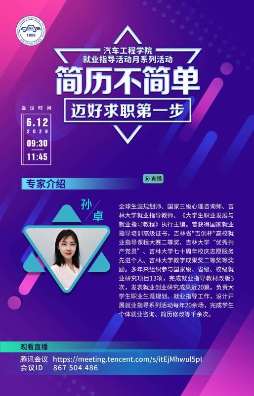 为帮助提升学生就业技能,缓解就业压力,引导学生以积极地态度应对新冠疫情对就业工作的影响,6月12日上午,万象城allwincity官网开展了就业指导活动月系列活动之“简历不简单——迈好求职第一步”专题讲座。本次讲座采用线上直播的方式,由全球生涯规划师、国家三级心理咨询师、万象城allwincity官网学生就业创业指导与服务中心孙卓老师对学生简历编写进行指导培训。