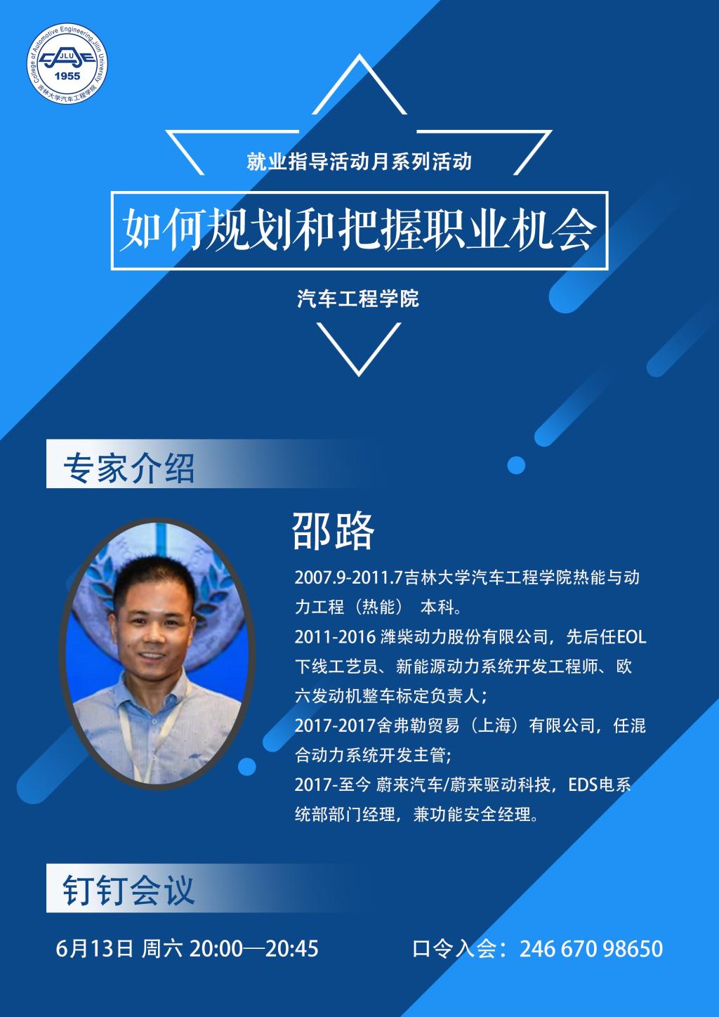 为使同学们认清就业形势,加强对行业与企业的了解,明确就业方向及目标,6月13日晚上20时,万象城allwincity官网举办了“如何规划和把握职业机会”就业指导讲座。学院能源与动力工程专业2011届毕业生,历任潍柴动力公司工程师、舍弗勒公司系统开发主管,现任蔚来汽车EDS电部门部门经理兼功能安全经理的邵路进行分享经验,会议由学院热能系主任李明老师主持。