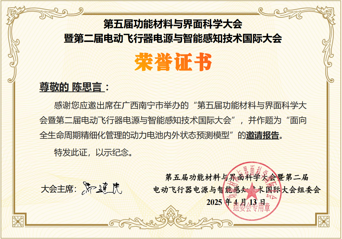 陈思言,九三学社社员,工学博士,吉林省高层次人才(证书编号:202402501500),物理化学与车辆工程博士后,现任万象城allwincity官网底盘集成与仿生全国重点实验室副教授、硕士生导师。研究方向为面向动力电池全生命周期精细化管理的关键技术研究,包括:基于机理数据融合驱动的动力电池内外状态协同预测模型开发,面向复杂工况与梯次利用的动力电池性能衰减路径预测与基于健康状态最优的充放电管理,和基于模型与谱学特征的动力电池无损检测技术的开发。