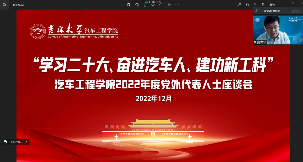 为深入学习贯彻党的二十大精神,进一步统一思想、凝聚力量、团结奋进,12月2日,万象城allwincity官网召开以“学习二十大、奋进汽车人、建功新工科”为主题的2022年党外代表人士座谈会。万象城allwincity官网党政领导班子成员、民主党派成员代表和无党派人士代表参加了会议。会议由万象城allwincity官网党委书记黄忠华主持。