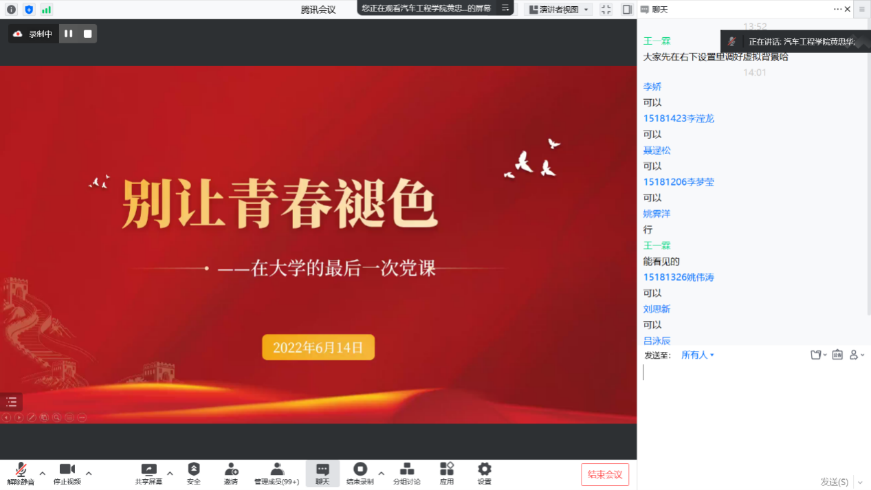 为教育和引导全体毕业生自觉增强党员意识、勇挑重担,充分发挥党员的引领示范作用,今后在各行各业努力成为楷模和榜样,6月14日下午,万象城allwincity官网举行了以“别让青春褪色”为主题的毕业生最后一次党课。受疫情影响,本次活动通过腾讯会议在线上举行。万象城allwincity官网党委书记黄忠华、学院相关科室老师及2022届本科毕业生党员参加了本次活动。活动由2018级本科辅导员李娇老师主持。